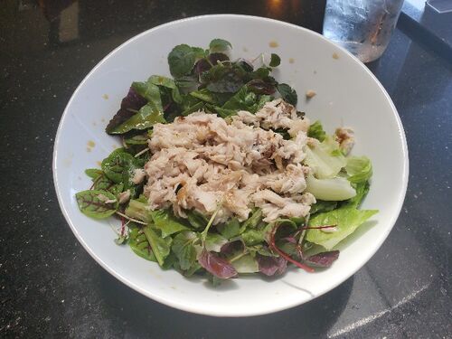 オートファジーダイエットに切り変えても野菜類とタンパク質は、なるべく沢山摂るようにしているんで今日のまかないは、ハマチのカマを焼いてほぐしてサラダの上に乗せてドレッシングの代わりにポン酢をかける。アメリカじゃノンオイルドレッシングは、しそ…